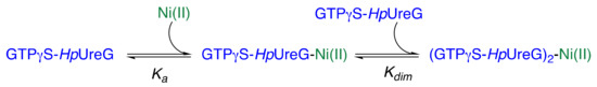 The thermodynamics of Ni(II) and GTPγS-driven protein dimerization was therefore addressed using ITC. Ni(II) ions were titrated over HpUreG in the presence of GTPγS in the sample cell. Negative peaks followed each injection of Ni(II) into the protein solution, indicating the occurrence of an exothermic reaction (Figure 2D, left panel). The observation of a slower endothermic effect following each injection, which terminates when one equivalent of metal is added to the protein solution, suggested the existence of another process, in addition to metal binding, similarly to what had been previously observed for the Ni(II)-sensor HpNikR [50]. This type of ITC trace can be interpreted either as a conformational modification or as a change in the oligomerization state of the protein. As dimerization was demonstrated by light scattering experiments (Figure S3) [29], and the shape of the binding isotherm clearly indicated two inflection points suggestive of two reactions occurring upon metal titration, the data were analyzed using a model involving two successive equilibria, with protein dimerization following the binding of one Ni(II) per protein dimer (Scheme 1).
