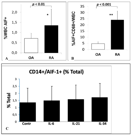 Flow cytometry analysis of WBC and PMBCs of OA and RA patients. (A) The percentage of WBC (white blood cell) AIF-1 (allograft inflammatory factor-1)-positive cells in the blood of rheumatoid arthritis (RA) and osteoarthritis (OA) patients, * p < 0.01. (B) The percentage of AIF-1+/CD68+/WBC cells in synovial membranes of OA and RA patients, ** p < 0.001. (C )CD14+/AIF-1+ cells as a % of total cell count after peripheral blood mononuclear cell (PBMC) stimulations; the differences were statistically non-significant.