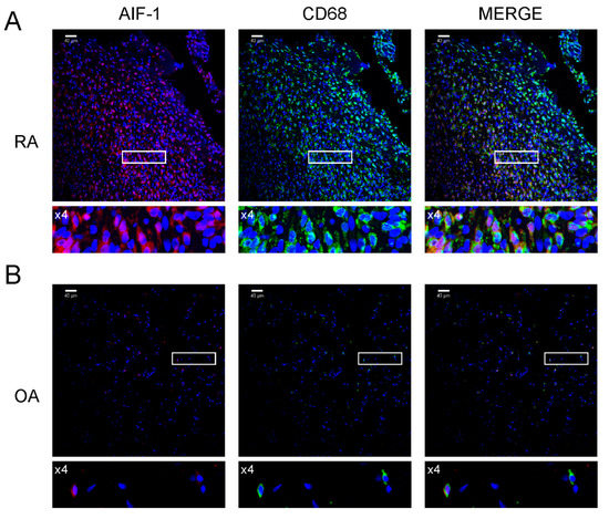 Immunolocalization of AIF-1 and CD68 in synovial membrane sections. Images are shown in separate fluorescence channels: red for AIF-1, green for CD68, as well as merged. (A) Sections from RA patients, showing predominant expression of AIF-1/CD68 cells compared to osteoarthritis patients. (B) Sections from OA patients. Four-fold magnifications of the highlighted area are included under each photo. The scale bar is 40 μm; only representative images are presented. Lower panels show regions of interest- ROI (white frames) with higher power magnification (zoom ×4).
