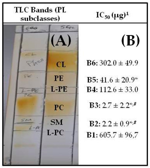 24]. Six major PL subclasses of the bioactive PL from Irish ale were determined in specific TLC bands when compared to specific standards of phospholipid subclasses; TLC bands 1–6 of the Irish ale PL extracts were found to possess similar R