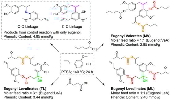 Schematic presentation of the synthesis, representative chemical bonds in the products, from a control reaction with eugenol only and the plasticizer candidates including eugenyl levulinates (ML and TL) and eugenyl valerate (MV) (C-O linkages in blue; C-C linkages in purple; phenolic ester bonds in red; aliphatic ester bonds in orange; converted-ketones in green).