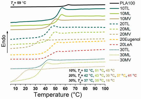 Differential scanning calorimetry (DSC) thermograms for neat PLA and the different blends.