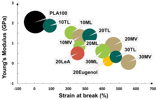 Mechanical properties of PLA blends (the relative bubble size symbolizes stress at break values).