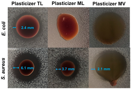 Zone of inhibition test on neat plasticizers against E. coli and S. aureus.