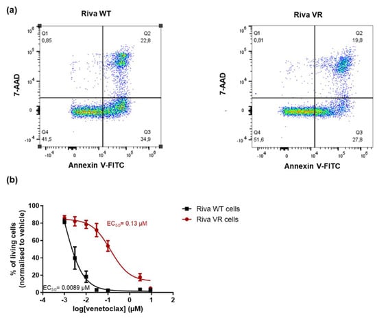 To obtain venetoclax-resistant Riva cells (Riva VR), parental Riva cells (Riva WT) were chronically exposed to increasing concentrations of venetoclax. A dose–response experiment indicated approximately a tenfold difference in venetoclax sensitivity as demonstrated by the different EC50 values for venetoclax (Figure 1a,b) derived from FACS measurements (AnnexinV-7-AAD staining). Thus, these data confirm the presence of venetoclax resistance in the VR cell line relative to the parental cell line.