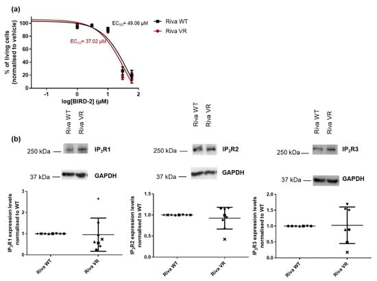 Previous work performed by our lab [30] revealed an inverse correlation between venetoclax and BIRD-2 sensitivity in DLBCL cell lines. Based on these findings, we hypothesized that the cells with acquired resistance to venetoclax could have become more susceptible to BIRD-2, illustrating a shift from Bcl-2’s reliance on the hydrophobic cleft towards a BH4 domain-dependent mechanism. However, a dose–response experiment showed no significant difference in the EC50 values of BIRD-2 in Riva VR compared to Riva WT (Figure 2a). As in previous work where we associated BIRD-2 sensitivity of DLBCL cells with IP3R2-expression levels [28], we compared the expression of IP3R2 and the other IP3R isoforms between Riva WT and Riva VR. Yet, consistent with the findings that Riva VR cells were not more sensitive to BIRD-2 than Riva WT cells, IP3R2-expression levels were very similar between Riva WT and Riva VR cells (Figure 2b). Similarly, the expression levels of the other isoforms of the IP3R (IP3R1 and -3) were not different between Riva WT and Riva VR cells (Figure 2b). These data demonstrate that cancer cells with acquired venetoclax resistance do not become dependent on Bcl-2’s non-canonical role at the ER for survival.