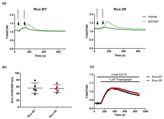 Cytosolic IgG/IgM Ca2+ responses and ER Ca2+ content do not differ between Riva WT and Riva VR. (a) Typical cytosolic Ca2+ traces in Fura-2-AM-loaded Riva WT and VR. Sixty seconds after the chelation of extracellular Ca2+ with EGTA (3 mM), the cells were stimulated with vehicle or 12 μg/mL IgG/IgM to provoke a cytosolic Ca2+ signal. (b) Analysis of the area under the curve (AUC) of the IgG/IgM-triggered peak. Data are presented as average ± SEM (N = 5). (c) Cytosolic Ca2+ traces in Fura-2-AM-loaded Riva WT (black) and VR (red). Sixty seconds after the chelation of extracellular Ca2+ with EGTA (3 mM), the cells were treated with thapsigargin (1 μM) to deplete ER Ca2+ stores. Data are presented as average ± SEM (N = 6).