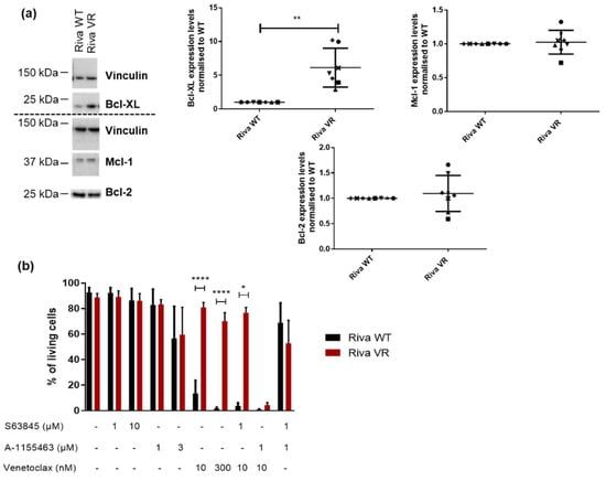 Bcl-XL-expression levels are upregulated in Riva VR cells. (a) Left: representative Western blots of Bcl-XL-, Mcl-1- and Bcl-2-expression levels in Riva WT and VR cells. Vinculin was used as a loading control. Right: quantification of Bcl-XL-, Mcl-1- and Bcl-2-expression levels. Expression levels in Riva VR were normalized on Riva WT, which was set at 1. Data are presented as the average ± SD (n ≥ 7); ** p < 0.01. (b) Flow cytometric analysis of AnnexinV-FITC negative and 7-AAD negative cells treated with BH3-mimetic inhibitors of Bcl-XL (A-1155463), Mcl-1 (S63845) and Bcl-2 (venetoclax) for 24 h. Data are represented as mean ± SD (n = 5); * p < 0.05, **** p < 0.001.