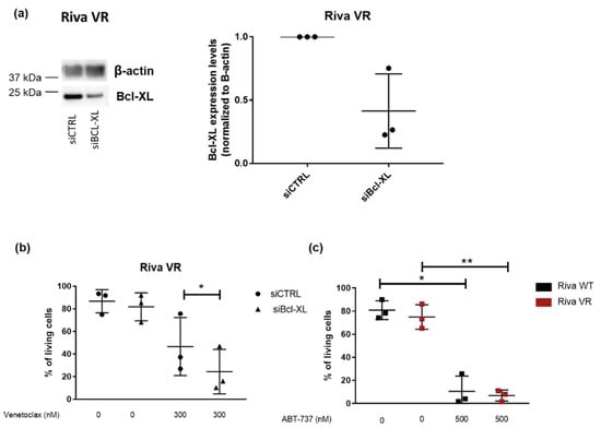 To further corroborate these findings, we used a siRNA-mediated knockdown approach to decrease the expression levels of Bcl-XL in Riva VR cells. Western blot analysis validated that siBcl-XL could reduce Bcl-XL-protein levels in Riva VR cells (Figure 5a). Furthermore, cell death analysis in Riva VR cells treated with siCTRL or siBcl-XL revealed that knockdown of Bcl-XL sensitized the cells to venetoclax (300 nM) (Figure 5b). In addition, Riva WT and VR cells were treated with ABT-737, a non-selective BH3 mimetic inhibitor of both Bcl-2 and Bcl-XL [35]. While Riva VR cells are much more resistant to venetoclax than Riva WT cells, Riva VR and Riva WT seemed equally sensitive to ABT-737 (Figure 5c). Both experiments underpin our hypothesis that the resistance of Riva VR cells towards venetolax is at least in part due to upregulation of Bcl-XL.