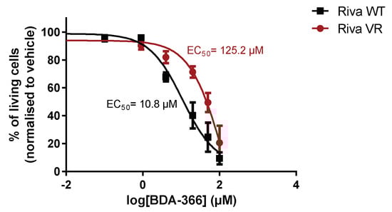 Finally, we also assessed the sensitivity towards another presumed BH4-domain inhibitor of Bcl-2, BDA-366 [31]. This small molecule was identified from a screen for BH4-domain-interacting molecules and is thought to switch Bcl-2 into a pro-apoptotic protein by triggering surface exposure of its BH3 domain [36]. However, recent work has cast some doubts on whether BDA-366 is a bona fide Bcl-2 inhibitor [34]. Indeed, when Riva WT and Riva VR cells were treated with BDA-366 in a dose–response experiment, Riva WT cells were approximately ten times more sensitive to the compound than Riva VR cells (Figure 6). This indicates that induction of venetoclax resistance also results in resistance against BDA-366.