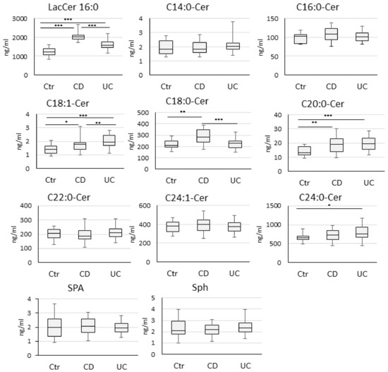 3.1. Sphingolipid Concentration in Crohn’s Disease, Ulcerative Colitis and Control Group