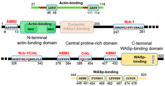 Very rudimentary information is available for mammalian actin-binding protein 1 (mAbp1) and cortactin, two proteins with a similar domain organization including an N-terminal F-actin binding motif and a C-terminal SH3 domain. The high sequence identity of their SH3 domains (62% amino acid identity of mAbp1 and cortactin) suggests interaction with the same ligands [91]. A yeast-two-hybrid assay identified WIP residues 136–205 as a cortactin-binding segment while cortactin failed to interact with full-length WIP lacking residues 110–170 (Δ110–170) [92]. mAbp1, too, was found to bind WIP, and deletion of WIP residues 110–170 reduced the interaction by more than 70% [93]. The W→K mutation of the binding site tryptophan of both the cortactin and mAbp1 SH3 domains, W525K and W415K respectively, blocked binding of cortactin/mAbp1 to WIP, confirming SH3-mediated binding for cortactin and mAbp1 [92,93]. In addition, binding of WIP to the hematopoietic homologue of cortactin, hematopoietic lineage cell-specific protein 1 (HLCS1) was proven and W→Y mutation of the HLCS1 SH3 domain abolished binding [94]. Notably, the dissociation constant for the complex of full-length cortactin and WIP was estimated as 0.3 µM by densitometry (based on the correlation between the concentration of a complex and the intensity of a Western-visualized SDS-PAGE band), constituting a relatively high affinity for SH3-mediated interactions [92]. Similarly, the intersectin adaptor proteins intersectin-1 (ITSN1, the short variant ITSN1-S and the long variant ITSN1-L) and intersectin-2 (ITSN2) have been found to interact with the 318–450 and 13–450 segments of WIP respectively (overlapping the CrkL/Nck sites, see below), both omitting the N-WASp-binding segment to confirm that the interaction is not mediated by N-WASp [95], while in yeast-two-hybrid assays the 353–503 segment interacted with ITSN2, among others [96]. In vitro binding assays indicated that of their five different SH3 domains (labeled A–E), the interaction with WIP occurs via the A/C/E domains, whereas the B/D domains have no WIP affinity [95].