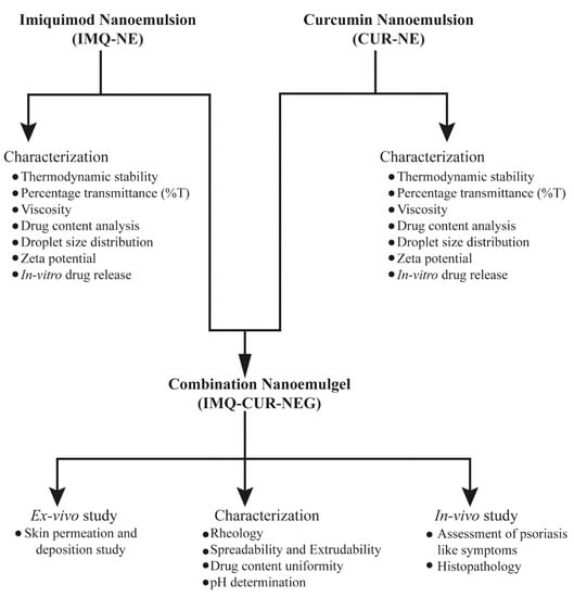 This work aims to improve the topical delivery of IMQ and to reduce the associated adverse effect. The IMQ-NE formulation was optimized to improve the topical delivery of IMQ. Further, CUR-NE was added to the formulation in order to reduce the IMQ-associated skin reaction side effect. Both formulations were incorporated in a hydrogel system to formulate a nanoemulgel (NEG) (schematic presentation of the experimental methodology illustrated in Figure 1). This hydrogel system will hydrate the skin and enhance the performance of the NE-mediated delivery of encapsulated therapeutics.