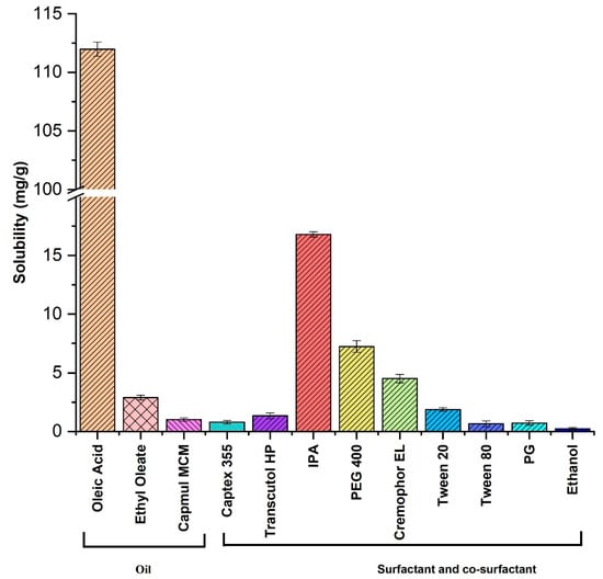 The solubility studies of IMQ in different components of NE (oil, surfactant, co-surfactant) were carried out at room temperature. The solubility of IMQ among the tested oil systems was found to be maximum in oleic acid (111.3 ± 0.60 mg/g), followed by ethyl oleate (2.9 ± 0.2 mg/g), capmul® MCM (1.02 ± 0.01 mg/g), and captex®355 (0.8 ± 0.01 mg/g) (Figure 2). The weak base property of IMQ helped to increase its solubility in oleic acid oil and convert IMQ into the corresponding salt form [25,26]. Oleic acid is a monounsaturated omega-9 fatty acid with a long chain of 17-carbon atoms and terminal carboxyl group. It is commonly found in various plant and animal products.