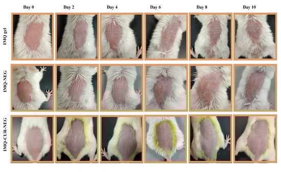 Psoriasis-like symptoms like scaling, redness, and skin thickening started to appear on BALB/c mice treated with IMQ gel from the second day and progressively worsened until the tenth day of the experiment (Figure 7). BALB/c mice treated with IMQ-NEG exhibited the delayed appearance of psoriasis-like symptoms (Figure 7). These delayed symptoms are correlated with the controlled release of IMQ from the IMQ-NEG formulation. BALB/c mice treated with IMQ-CUR-NEG did not exhibit any significant appearance of psoriasis-like symptoms like scaling, redness, and skin thickening (Figure 7). The disappearance of psoriasis-like symptoms was correlated with the anti-psoriatic activity of CUR [43].