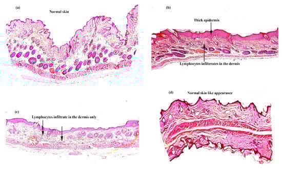 Histopathology of the skin of normal BALB/c mice after ten days of topical treatment: (a) untreated skin; (b) skin treated with the IMQ gel; (c) skin treated with IMQ-NEG; and (d) skin treated with IMQ-CUR-NEG (at 10x magnification).