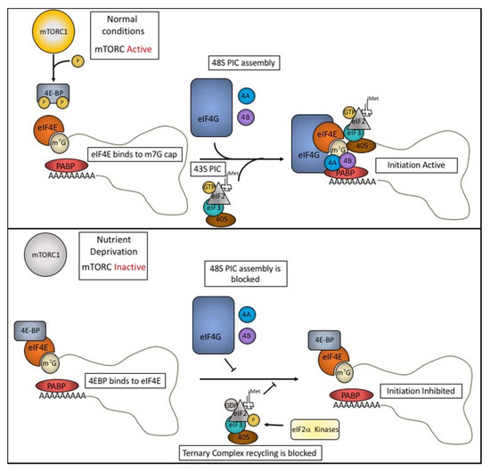 The mammalian target of rapamycin complex 1 (mTORC1) plays an important role in reprogramming protein synthesis in cells subjected to metabolic stress. This is accomplished by altering the structure of the translation initiation complex to modulate the efficiency of protein synthesis. Under growth conditions, active mTORC1 phosphorylates the eIF4E Binding Proteins (4E-BPs), to prevent their interaction with eIF4E (Figure 1, upper panel). This allows eIF4E to complex with eIF4G and eIF4A to assemble initiation complexes that support protein synthesis. Under starvation conditions, inactivation of mTORC1 results in a lack of phosphorylation of 4E-BP. Unphosphorylated 4E-BP binds to eIF4E, displacing eIF4G, and inhibiting protein synthesis [8]. Thus, phosphorylation of eIF2α and dephosphorylation of 4E-BP play important roles in reprogramming protein synthesis during stress.