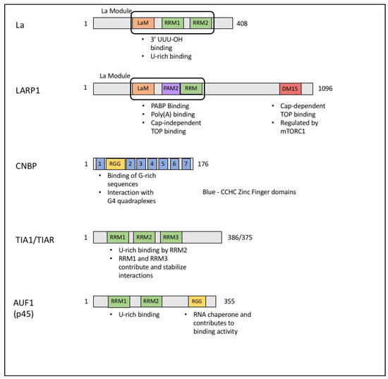 19. Maraia, R.J.; Mattijssen, S.; Cruz-Gallardo, I.; Conte, M.R. The La and related RNA-binding proteins (LARPs): Structures, functions, and evolving perspectives. Wiley Interdiscip. Rev. RNA 2017, 8, e1430. [Google Scholar] [CrossRef] [PubMed]