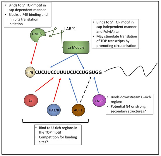 Figure 4. Multiple proteins bind to 5’ TOP motifs and affect translation. Schematic depicting potential interactions of RNPs with the 5’ TOP motif. Red arrows depict inhibition of expression and blue arrows depict promoting effects on expression. Different part of LARP1 (green) can interact with the TOP motif and can both promote or repress translation depending on the context. La (red) and TIA1/R (blue) bind to U-rich regions of the TOP motif and are thought to play an inhibitory role in TOP expression. AUF1 (brown) also binds to U-rich regions of the TOP motif but appears to have a promoting effect on expression. Furthermore, La, TIA1/R, and AUF1 may compete for binding sites. CNBP interacts with G-rich regions near the distal part of the TOP motif. CNBP as well as AUF1 may associate with secondary structures and potential G4 quadraplexes that may form in this region of some TOP motifs through their RGG motifs.