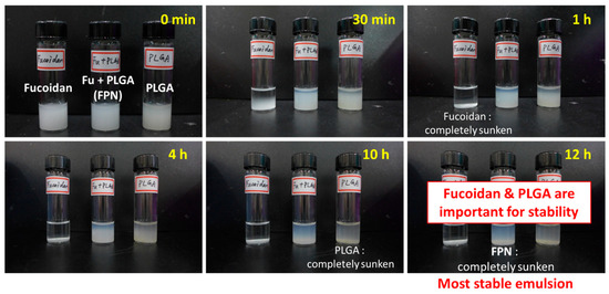 To study the effects of fucoidan on nanoemulsions, three emulsions containing fucoidan alone (Fucoidan), PLGA alone (PLGA), and a combination of fucoidan and PLGA (Fu + PLGA) were examined after emulsification without removing the organic solvent. By observing the variation of emulsions over time, it was found that white turbid layers in all three emulsions gradually sunk. The phase separation phenomenon called “creaming” or “sedimentation” is the migration of the dispersed phase in an emulsion as a reflection of instability. The sinking rate (sedimentation rate) can be an indicator of stability of the emulsions, while higher stability makes droplets sink more slowly [19,40]. In Figure 1, droplets with the highest to lowest sinking rate were ranked as fucoidan emulsion, PLGA emulsion, and Fu + PLGA emulsion. This indicated that the Fu + PLGA emulsion is the most stable among the three emulsions, implying the assistance of fucoidan in the stability of droplets or particles in the emulsion. However, it was also noted that the emulsion containing fucoidan alone was not sufficiently stabilized, so the hydrophobic material PLGA was necessary to form the rigid structure of the particles.