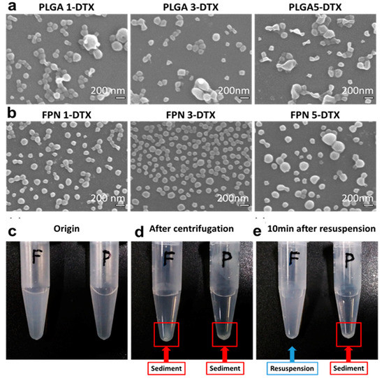 To further study the interaction between PLGA and Fucoidan in nanoparticles, SEM and TEM were used to observe the morphology of NPs. As illustrated in Figure 2a,b, the SEM image of particle morphology and distribution demonstrated the contribution of fucoidan to stabilize nanoparticles in suspension. Particles prepared without fucoidan (PLGA-DTX) did not exhibit uniform sizes and some of them aggregated together compared with those particles prepared with fucoidan (FPNs–DTX) as mentioned above. To investigate the surface hydrophobicity of particles prepared with or without fucoidan, the states of FPN 3-DTX (F) and PLGA 3-DTX (P) suspensions after centrifugation were observed in Figure 2d,e. Despite the similar appearance of both FPN 3-DTX and PLGA 3-DTX suspensions before and after centrifugation, FPN 3-DTX seemed to suspend and disperse well again in contrast to the sediment of PLGA 3-DTX for 10 min after resuspension. This indicates that the fucoidan of FPN 3-DTX can modify the surface hydrophobicity of PLGA and make particles disperse more easiily in an aqueous environment than PLGA 3-DTX, which is beneficial for delivery in the human circulatory system.