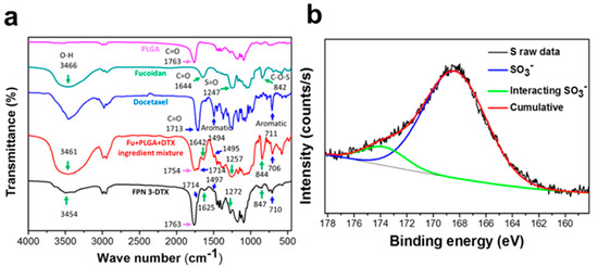 (a) Fourier transform infrared (FTIR) spectra of PLGA, fucoidan, docetaxel, powdered mixture of three main ingredients, and FPN 3-DTX. (b) Cumulative sulfur 2p (S 2p) X-ray photoelectron spectrum of FPN 3-DTX based on X-ray photoelectron spectroscopy (XPS).
