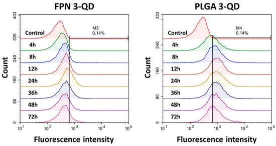 Quantitative evaluation of cellular association was performed by flow cytometry as shown in Figure 7. The results were in line with the observations by fluorescence microscopy. The fluorescence intensity was observed to reach saturation at 24 h incubation for FPN 3-QD and at 12 h for PLGA 3-QD. The median fluorescence intensity (MFI) detected for PLGA 3-QD was higher than that for FPN 3-QD at all of the incubation times. On the other hand, higher fluorescence intensity compared with the untreated control indicates cell association with fluorescence-labeled particles.