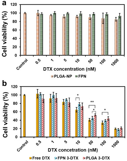 Cell viability of MDA-MB-231 breast cancer cells treated with (a) drug-loaded nanoparticles (FPN 3-DTX and PLGA 3-DTX) and free DTX. (b) blank nanoparticles (FPN and PLGA) in which the concentration of nanoparticles was equal to drug-loaded nanoparticles after 72hr treatment. Results are expressed as the mean ± SD of three replicates for each treatment (n = 3). Marked asterisks (*) with * p < 0.05 and ** p < 0.01 represent statistically significant differences.