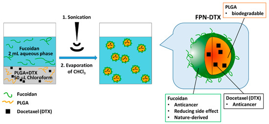 Illustration of FPNs–DTX preparation using a one-step emulsification process (Fucoidan in 2 mL aqueous phase and PLGA+DTX in 50 μL Chloroform phase).