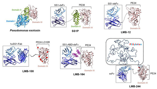 Structures of mesothelin (MSLN)-targeted recombinant immunotoxins (iToxs). Pseudomonas exotoxin (PE) contains three domains: domain I (binding), domain II (linker), and domain III (catalytic). SS1P was engineered with a MSLN-targeted dsFv (SS1) fused to PE38, containing domains II and III of PE. LMB-12 was formed by attaching SS1 to PE24 (only furin cleavage site of domain II remains from PE38), in an effort to eliminate T cell epitopes. LMB-100 contains a humanized anti-MSLN Fab linked to a modified PE24, designed to eliminate remaining B cell epitopes. The red balls in the model indicate individual residues that were mutated during the technical deimmunization. LMB-164 is a derivative of LMB-12, with insertion of an albumin binding domain, shown in lavender. Finally, LMB-244 consists of a single chain Fv (scFv), linked to PE24 that contains a cysteine site-specific PEGylation on the PE24 molecule. The PE38 structure is the X-ray crystallograph of wild type PE structure (PDB:1IKQ). All other iToxs are modeled from the crystal structure of mesothelin and antibody complex (PDB: 4F3F) with the PE38. LMB-164 includes the albumin binding domain modeled from the one in Streptococci (PDB: 1GJS). The domain III of PE with substrate NAD and AMP (PDB: 1DMA) and the complex structure of PE and Elongation factor 2 (PDB: 1ZM4) were superposed to iToxs models, to avoid potential binding interference when generating the LMB-164 and LMB-244 models. Molecular graphics generated with UCSF Chimera were developed by the Resource for Biocomputing, Visualization, and Informatics at the University of California, San Francisco, with support from NIH P41-GM103311.
