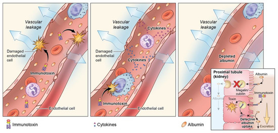 Historically, iTox-mediated CLS was thought to be caused by direct damage to endothelial cells, through either off-target uptake, or the presence of specific binding domains within PE that could direct the toxin to endothelial cells [108]. There is currently no clinical evidence to support or refute this mechanism. It has also been hypothesized that systemic inflammation induced by the toxin moeity results in the secretion of a yet unidentified cytokine that induces CLS. Consistent with this hypothesis, the systemic inflammatory marker C-reactive protein does increase in patients following LMB-100 administration, but association between CLS and a specific cytokine has not been established [93]. More recently, Liu et al. have suggested that CLS may result from direct toxicity to proximal tubule cells in the kidney, causing a loss of albumin in the urine [109]. This loss of albumin reduces osmotic pressure in the vasculature, and favors the accumulation of fluid in the tissue at the expense of circulating volume, the clinical scenario that is observed in patients with CLS. This study further demonstrated that co-administration of l-lysine for renal protection can reduce renal damage in mice. This strategy has yet to be tested in patients.