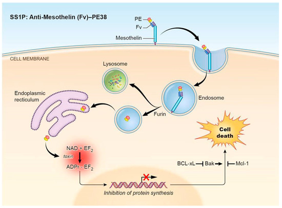 Pseudomonas exotoxin A (PE)-immunotoxin pathway. PE-based immunotoxins such as the mesothelin-targeting immunotoxin SS1P or LMB-100 act through a pathway involving (1) binding to the target antigen and internalization, (2) processing and trafficking, (3) inhibition of protein synthesis, and (4) induction of apoptosis. Abbreviations: PE: Pseudomonas exotoxin A; Fv: fragment variable; PE38: truncated PE fragment; EF2: elongation factor 2.