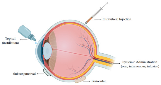 The eye is considered an immune privileged organ mainly due to the blood–retinal barriers, the avascular character of the cornea, the absence of a lymphatic drainage from the anterior chamber, the presence of soluble immunomodulatory factors in aqueous humor (released from the cells and tissues surrounding the anterior chamber and secreted by the ciliary body), and the cell-surface immunomodulatory factors expressed on parenchymal cells [48]. Among these, blood–ocular barriers play a protective role that prevents the entry of molecules from the systemic circulation into the ocular compartments. These barriers are classified into the blood–aqueous barrier (BAB) and the blood–retina barrier (BRB), located in the anterior and posterior segments of the eye, respectively. The treatment of diseases involving structures of the posterior segment of the eye (such as choroid, vitreous humor, and retina) is one of the main bottlenecks in pharmaceutical technology [49]. Figure 2 illustrates the different administration routes for drug delivery to the eye.