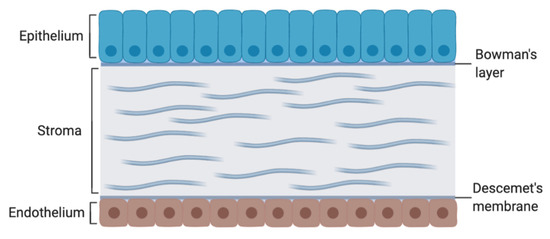 The corneal epithelium provides maximum resistance to drug penetration. As shown in Figure 3, it comprises tightly adherent cells, through which the drug molecules can penetrate via two ways: either partitioning through the cells (intracellular), with predominance for lipophilic drugs, or bypassing between the cells (paracellular), predominantly for hydrophilic and/or small-molecular-weight drugs. Moreover, the lipophilic nature of the epithelial cells can block the passage of about 90% of hydrophilic drugs and about 10% of lipophilic drugs [51]. The stroma is an aqueous environment that limits the diffusion rate of highly lipophilic molecules. Bowman’s layer and Descemet’s membrane do not provide resistance for drug penetration, and the endothelium may play a small role in rate-limiting lipophilic compounds [51].