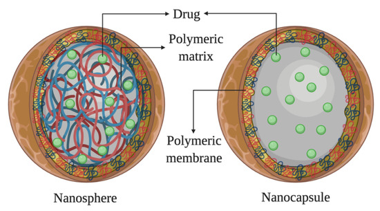 Among polymeric nanoparticles, nanospheres are composed of a vesicular architecture, with a polymer surrounding a liquid (hydrophilic or lipophilic) core (Figure 4, right). In such nanostructures, the drug moiety can either be dissolved inside or entrapped or adsorbed on the surface of particles [121].
