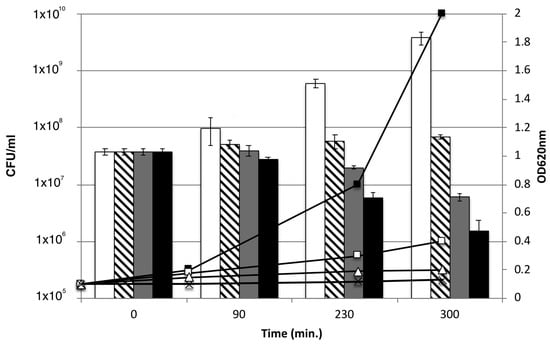 Comparison of the effect of AHR on the culture turbidity and on the cell viability. The optical density (OD620nm) and Colony-forming unit (cfu)/mL were measured at discrete time points and represented as a line chart and a column chart, respectively. The growth profiles were determined for MRSA CIP106760 (■; white bar) and CIP106760 was challenged with different concentrations of 7α-acetoxy-6β-hydroxyroyleanone; (□; striped bar) MIC/2 (3.9 mg/L); (Δ; grey bar) MIC (7.8 mg/L) and (✖; black bar) 2MIC (15.6 mg/L). Experiments were performed in triplicate. Shown are means with the standard error.