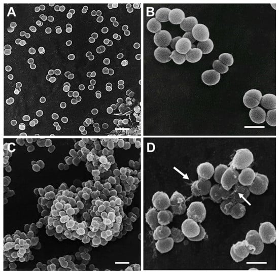 SEM micrographs of the MRSA/VISA CIP 106760 strain. A, B—Control bacteria. C—Bacteria treated with AHR at MIC/2, D—Bacteria treated with AHR at MIC showing localized cell wall disruption (arrows). Scale Bars: 4 μm (A, C); 1 μm (B, D).