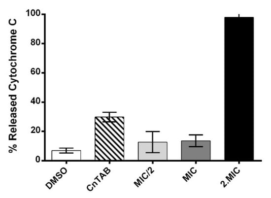 The influence of AHR in bacterial surface charge was determined by cytochrome c binding, as described []. Bacterial cells were grown to a mid-exponential phase in the presence of AHR at MIC/2, MIC and 2MIC concentrations, recovered by centrifugation, and washed twice in phosphate buffered saline (PBS) buffer (pH 7.2). The cellular suspension was adjusted to an OD600nm of 7.0 and was incubated with 0.5 mg/mL of cytochrome c for 10 min at room temperature; the supernatant was recovered by centrifugation and the cytochrome c content was determined by measuring the OD530nm. The experiment was performed in triplicate. The relative amount of bound molecule was determined by comparing the obtained values with the initial cytochrome c solution. All assays were performed in triplicate, and the results are representative of the average and standard error of the mean (SEM).