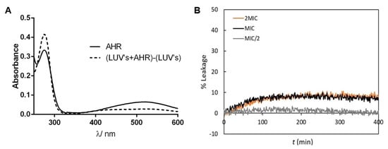 AHR at relevant antimicrobial concentrations interacts with phospholipid bilayers without compromising their integrity. (A) Electronic absorption spectrum of AHR at 20 µM in buffer Tris-HCl, pH 7.4 in the absence and presence of 1mM 1,2-dioleoyl-sn-glycero-3-phosphocholine (DOPC) large unilamellar vesicles (LUV) suspension. (B) Representative curves (median behavior from 6 independent experiments) of the effect of AHR on CF leakage from DOPC LUVs in suspensions, with a total lipid concentration of 0.5 mM, in the presence of different AHR concentrations: 15.6 mg/L (2 MIC, 40 µM), 7.8 mg/L (MIC, 20 µM) and 3.9 mg/L (MIC/2, 10 µM). These experiments were performed at 25 °C.