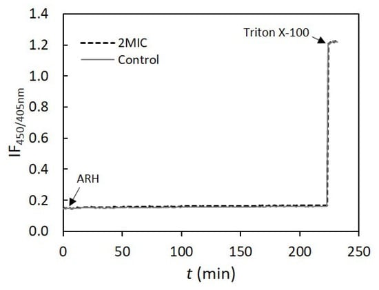 Effect of AHR at 15.6 mg/L (2 MIC, 40 µM) on lipid bilayer passive permeability to protons. Representative curves of the time-dependence of fluorescence intensity ratio of 8-hydroxypyrene-1,3,6-trisulfonic acid (HPTS) at the excitation wavelengths of 405 and 450 nm (IF450/405), at 25 °C. The experiments were conducted with high-cholesterol LUVs at total lipid concentration of 0.2 mM. Triton X-100 (1%) was added at 220 min, to obtain the value of IF450/405 corresponding to total pH gradient dissipation.
