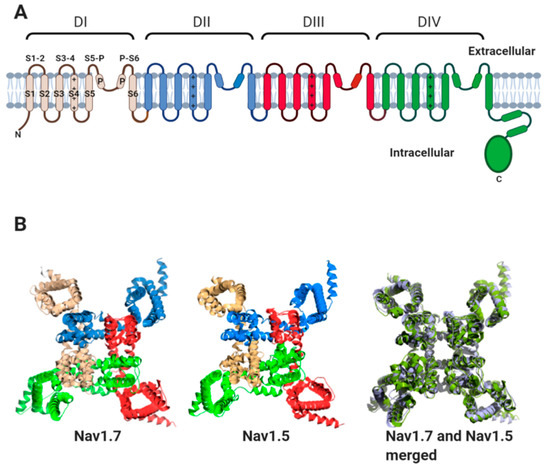 The Nav channel α-subunit. (A) Cartoon representation showing internally homologous domains DI-DIV. In DI, the location of transmembrane alpha-helices, S1–S6, the extracellular loops (S1-2; S3-4; S5-P and P-S6) and the re-entrant P helices are indicated. The positive charges on the S4 helices of each domain are indicated. (B) Three-dimensional structures of human Nav1.7 (PDB: 6JH8I), rat Nav1.5 (PDB: 6UZ3), and their aligned structures. The channels are viewed from above the plane of the plasma membrane. For Nav1.5 and Nav1.7, the domains DI-DIV are coloured as in (A). For aligned structures, Nav1.7 is coloured blue–white and Nav1.5 is coloured pale green.