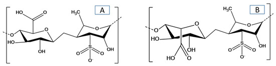 Chemical structure of ulvan with the major repeating disaccharide units: (A) glucuronic acid and rhamnose 3-sulfate, and (B) iduronic acid with rhamnose 3-sulfate.