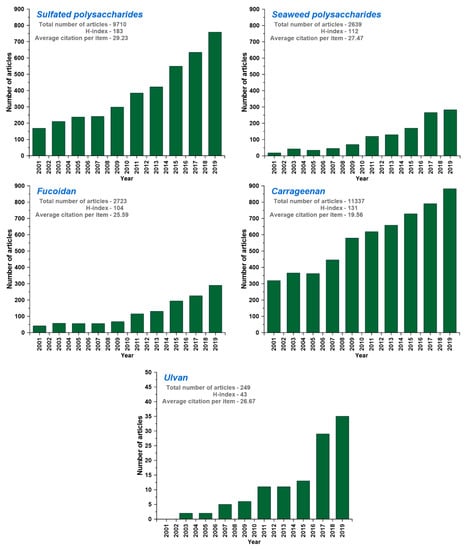 Institute for Scientific Information (ISI) Web of Science database for the articles published with the search topic of sulfated polysaccharides, seaweed polysaccharides, carrageenan, fucoidan, and ulvan within the 2001–2019 period (based on 3rd June, 2020 data).