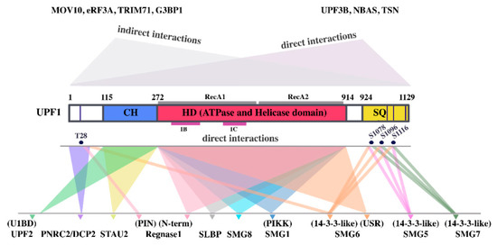 Functional up-frameshift factor 1 (UPF1) domains and their interactions with other proteins. СH: cysteine–histidine-rich domain, HD: helicase and ATPase domain with the RecA1, RecA2, 1B and 1C subdomains indicated by gray and magenta lines, respectively; SQ: serine–glutamine-rich domain. Validated phosphorylated amino acids with a function in protein–protein interactions, are shown in dark blue circles. Experimentally validated binding regions of UPF1-interacting UMD effector proteins are indicated below UPF1. UPF1-binding domains of UPF1-interacting proteins are indicated above the protein names. Proteins, that bind to UPF1 at as yet unknown sites are listed in the upper right corner. Proteins, that interact with UPF1 indirectly via RNA or other proteins are listed in the upper left corner.