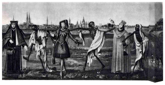 Detail of the Danse macabre (Totentanz) in the church St. Marien in Lübeck, Germany (Bernt Notke; ~1460; now destroyed). By analogy to this 15th century type of imagery, in the UMD family of decay pathways UPF1 represents Death (the skeleton in the picture) who leads the various types of UMD targets (representatives of any age and rank) to their final destiny.