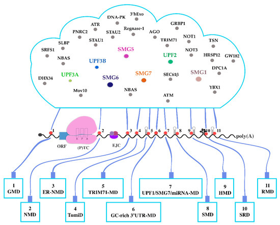 NMD targets can be roughly subdivided into two groups, namely (1) erroneous transcripts and (2) error-free transcripts. Nonsense mutations introduce a translation termination codon (TC) into the ORF of an mRNA and can arise from spontaneous mutations, faulty transcription, splice errors, unproductive genomic rearrangement and unprogrammed ribosomal frame shifting, thus generating mRNAs that are detected and degraded by NMD in its function as a “vacuum cleaner” [17]. Such flawed TCs have been dubbed premature termination codons (PTCs). However, in a more sophisticated role, NMD also acts to fine-tune the expression of a plethora of error-free physiological transcripts. Proteins encoded by such transcripts are often positioned at central nodes of biochemical pathways, thus tuning the pathways’ function, shaping the expression of whole cohorts of downstream effectors, and regulating important physiological processes such as cellular stress, development and embryogenesis [5,13,18,19,20,21,22]. Such error-free NMD substrates include transcripts with upstream open reading frames (uORFs), with splice events in their 3′ untranslated regions (3′UTR) generated by regular alternative splicing, with exceptionally long 3′UTRs, with selenocysteine codons that are interpreted as nonsense codons in the absence of selenocysteine or undergoing programmed ribosomal frameshifting. Although in the literature these TCs are also often called PTCs, strictly speaking they are not “premature”, but normal termination codons (NTCs).
