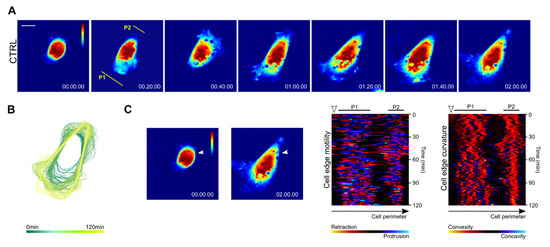 Microscopic images were pre-processed in ImageJ software and analyzed using the QuimP-19.08.01 plugin available from: http://www.warwick.ac.uk/quimp [59,60,61]. QuimP software was used as follows: Cell outlines were extracted from each frame of the image sequence using the BOA plugin (cell segmentation), the movements of cell outlines between individual frames were mapped using the ECMM Mapping plugin, and data analysis was performed by the Q Analysis plugin. The cell edge dynamic was visualized using three spatiotemporal maps. The cell track map is an overlay of cell outlines (with frame increment of 1). The motility map represents the movement of each node on the cell outline over time. The convexity map represents the curvature of the cell outline (in the range −1, 1), where negative values are concave (blue), and positive values convex (red).