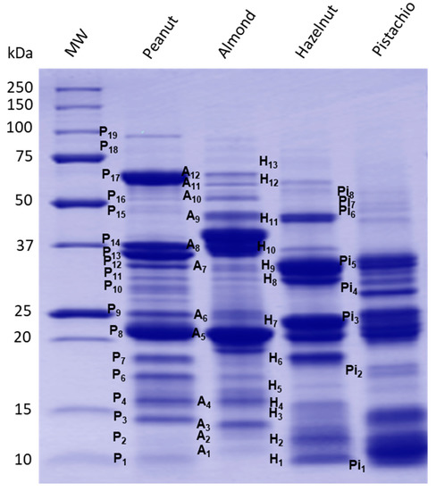Reduced SDS-PAGE profile of peanut, almond, hazelnut and pistachio protein extracts.