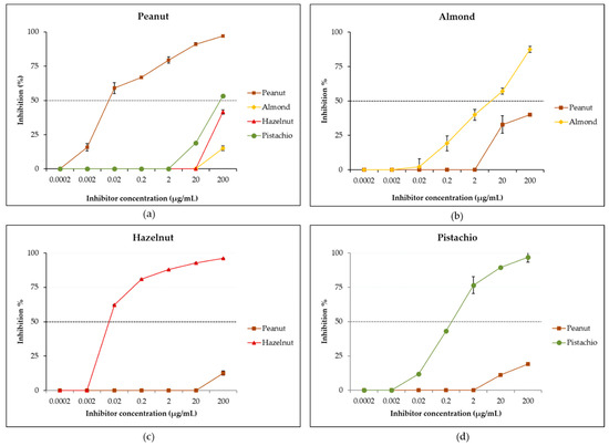 Reciprocal IgE inhibition ELISAs with peanut (a), almond (b), hazelnut (c) and pistachio (d) extracts adsorbed to the solid phase with inhibitor protein concentrations from 0.0002 to 200 µg/mL. The dashed horizontal line intercepts the inhibition curves at the median inhibitory concentration (IC50).
