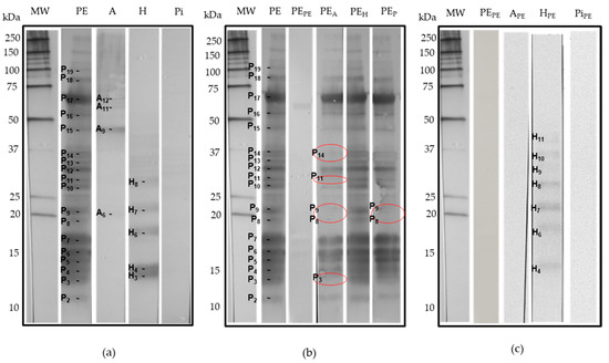 As expected, serum IgE binding to peanut was almost completely abolished after the preincubation with its homologous inhibitor (peanut extract) (Figure 5b). Interestingly, preincubation of the serum pool with the almond extract attenuated the extent of binding to the immobilized peanut proteins, with the particular disappearance of several IgE-binding protein bands—namely, P3, P8, P9, P11, P13 and P14 (Figure 5b)—which were attributed to the subunits and protein fragments of the 11S globulin Ara h 3/4 and to 2S albumin Ara h 6 (Figure 1 and Table 2). On the reverse, the preincubation of the serum pool with the peanut extract strongly inhibited IgE binding to the immobilized almond proteins (Figure 5c), confirming its cross-reactive antigen status and not a primary sensitizing antigen.